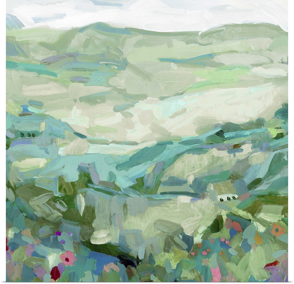 <p>Contemporary landscape painting of a hillside with wildflowers.</p>