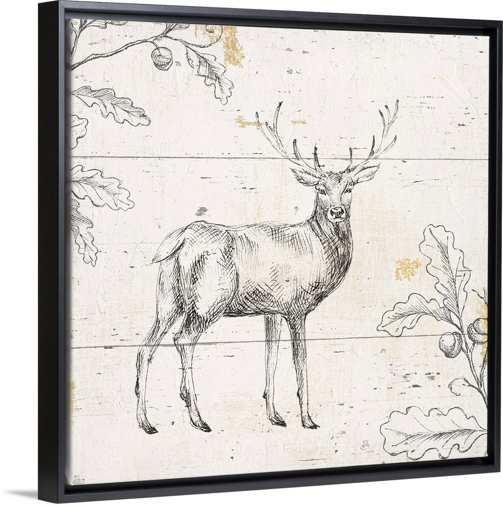 <p>Black and white sketch of a deer and leaves on a distressed wood paneled background with hints of gold.</p>