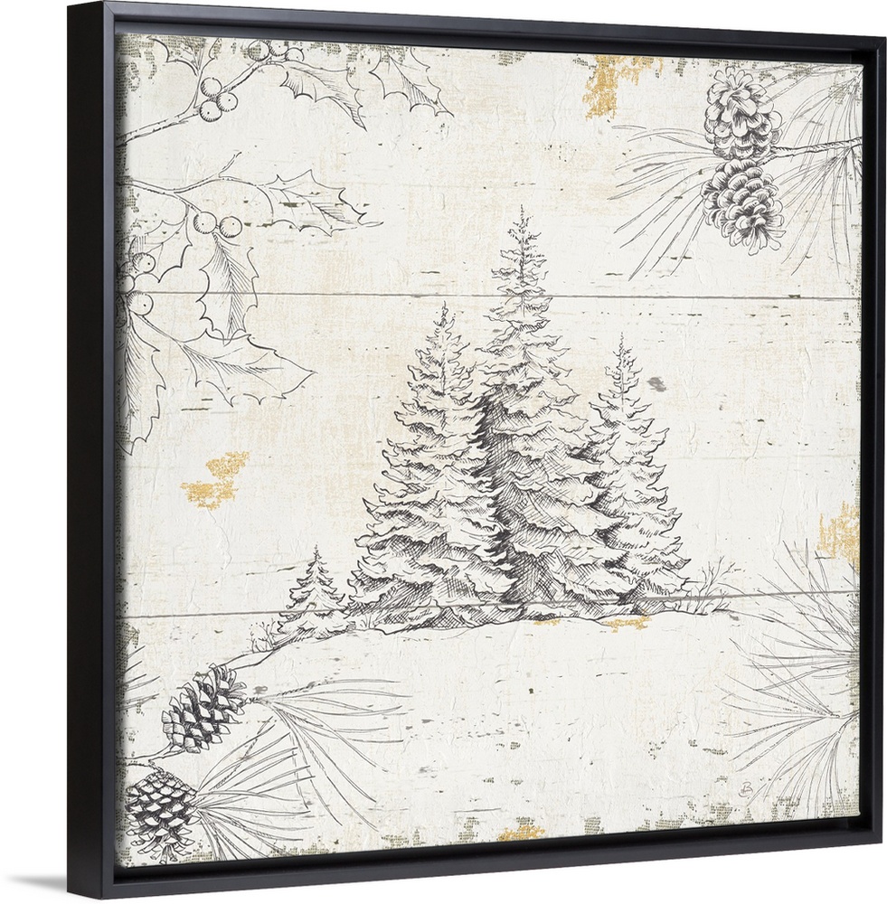 <p>Decorative lodge artwork featuring a sketched trees with pine greenery over distressed wood panels.</p>