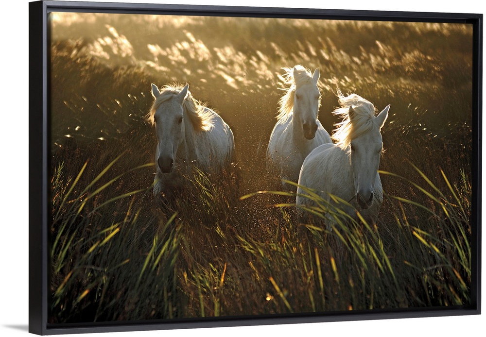 <p>Photograph of three white horse walking through a field of tall grass as the wind blows.</p>