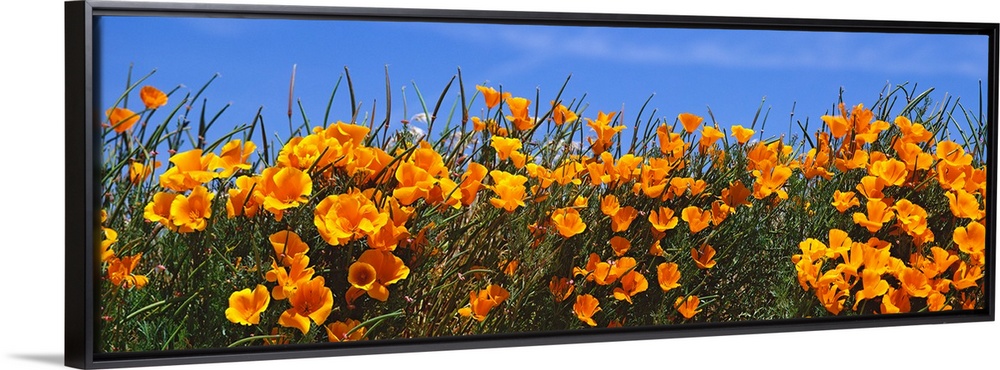 <p>Panoramic photograph of bright blooming wildflowers at the Antelope Valley California Poppy Reserve.</p>