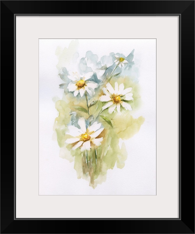 <p>Watercolor daises emerge from soft gradated blue and green hues against a white background in this painting.</p>