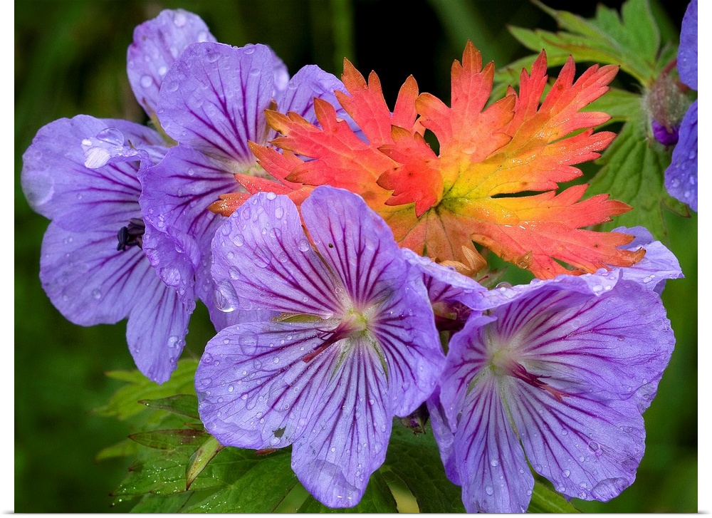 <p>Wild Geranium blooms with premature fall leaf coloring in Glen Alps, Chugach State Park, South-central Alaska, Summer</p>