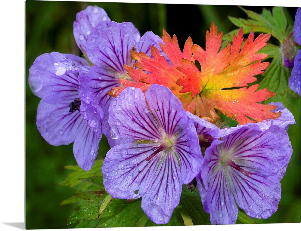 <p>Wild Geranium blooms with premature fall leaf coloring in Glen Alps, Chugach State Park, South-central Alaska, Summer</p>