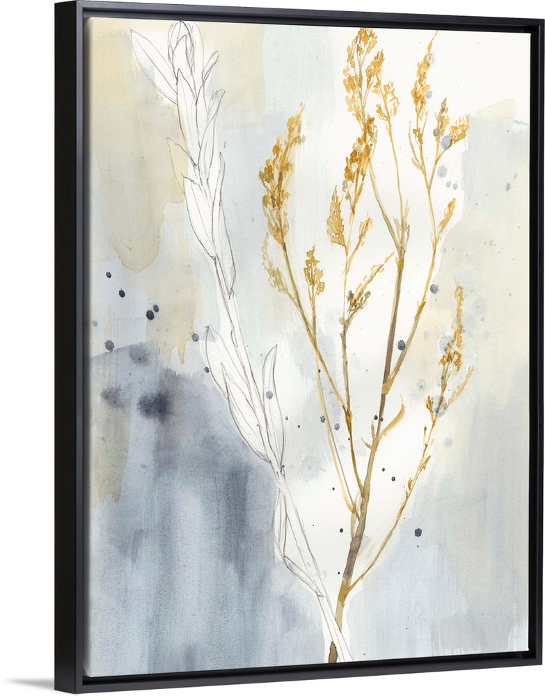 <p>This contemporary artwork features gestural sketches and soft watercolors to illustrate stalks of grasses against a soft gradated background.</p>