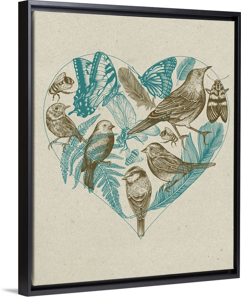 <p>Illustration of birds, bees, and butterflies inside of a heart in shades of brown and blue.</p>
