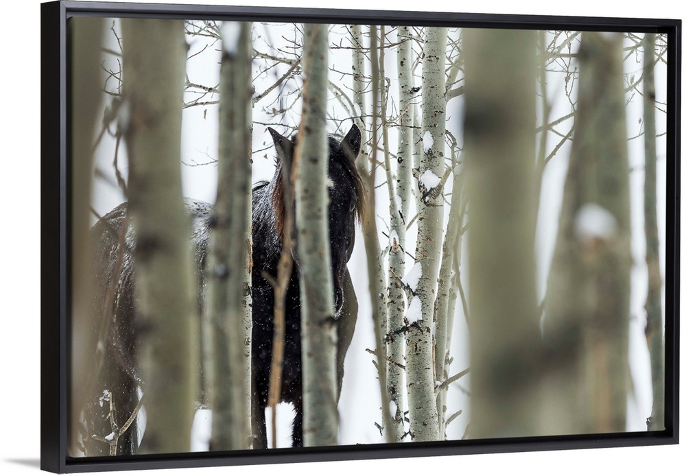 <p>Wild horse hiding in trees, Turner Valley, Alberta, Canada.</p>
