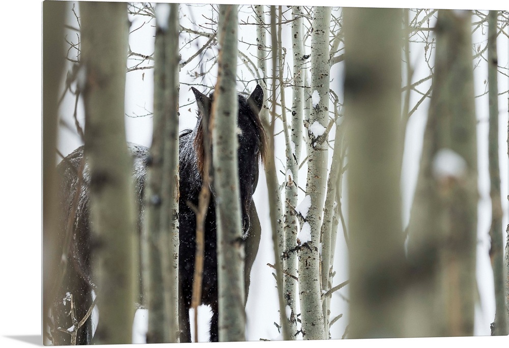 <p>Wild horse hiding in trees, Turner Valley, Alberta, Canada.</p>