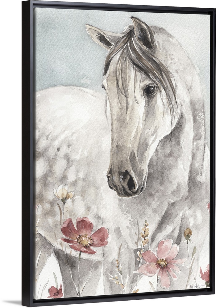 <p>Contemporary watercolor artwork of a white horse in a field of wildflowers.</p>