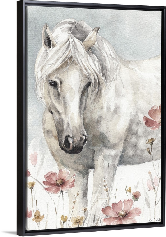 <p>Contemporary watercolor artwork of a white horse in a field of wildflowers.</p>