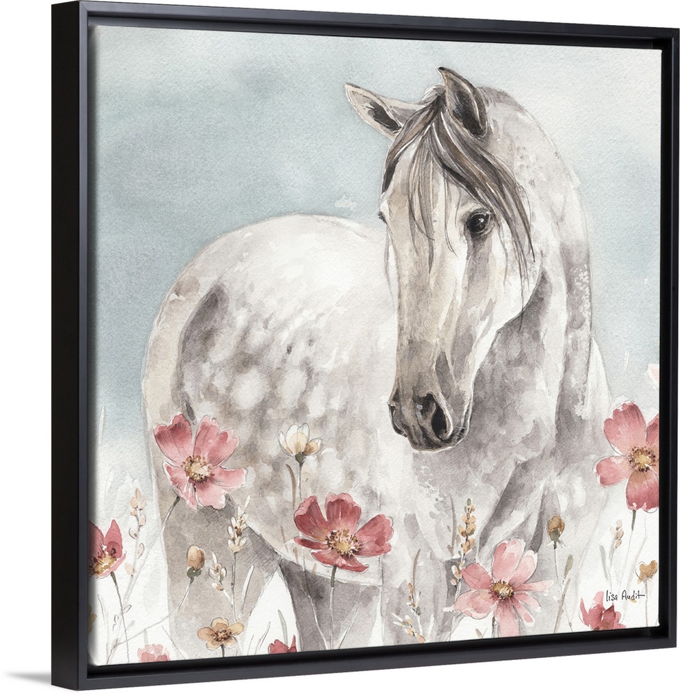 <p>Contemporary watercolor artwork of a white horse in a field of wildflowers.</p>
