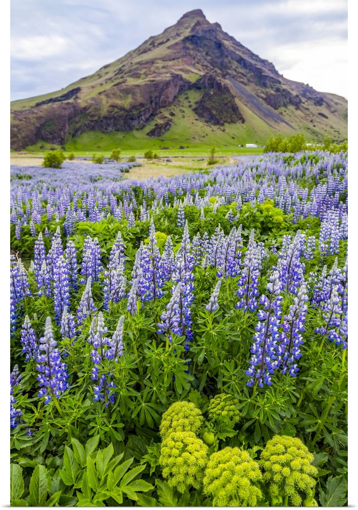 <p>A field of colorful wild lupin flowers in front of a volcanic mountain peak; Iceland</p>