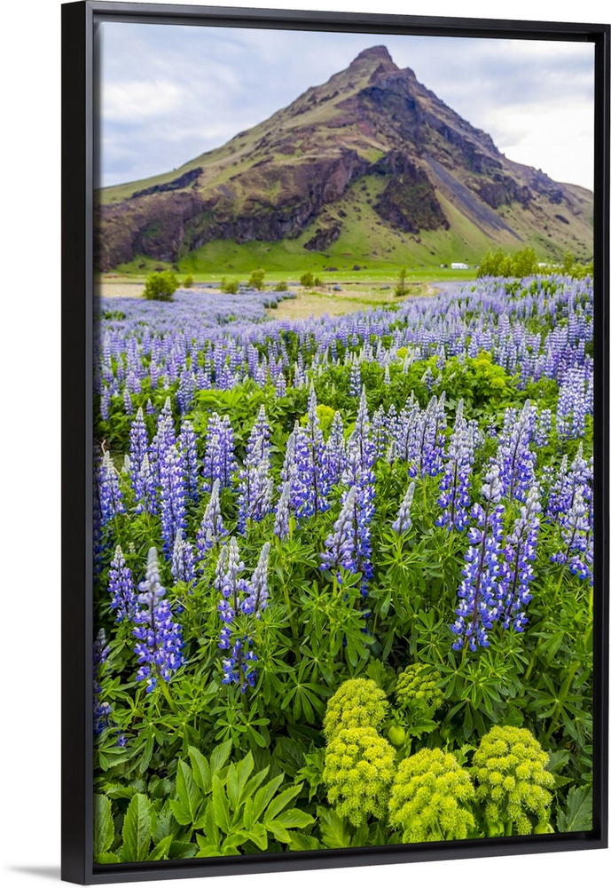 <p>A field of colorful wild lupin flowers in front of a volcanic mountain peak; Iceland</p>