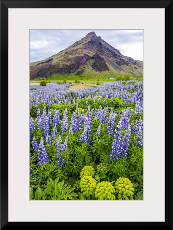 <p>A field of colorful wild lupin flowers in front of a volcanic mountain peak; Iceland</p>