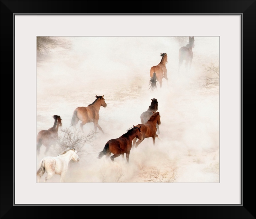 <p>Gila River Reservation, a stampeding group of wild mustangs kicking up dust.</p>