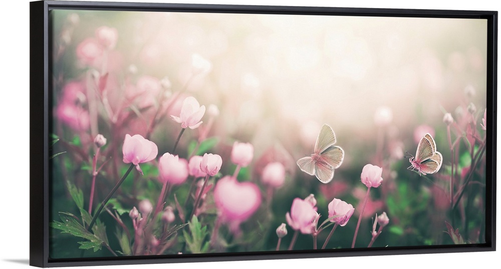 <p>Wild Pink Flowers And Two Fluttering Butterflies Bathed In Sunlight In Nature</p>