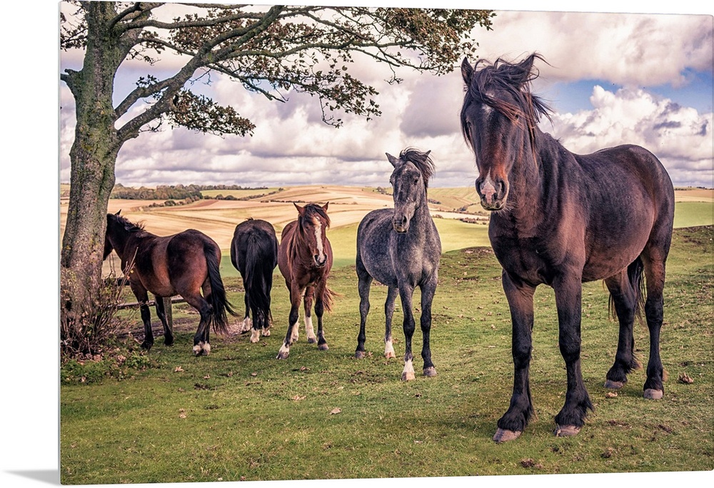 <p>Five wild ponies on Cissbury Ring on the South Downs with rolling hillside and agricultural land.</p>