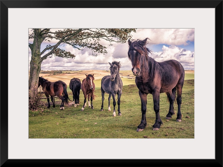 <p>Five wild ponies on Cissbury Ring on the South Downs with rolling hillside and agricultural land.</p>