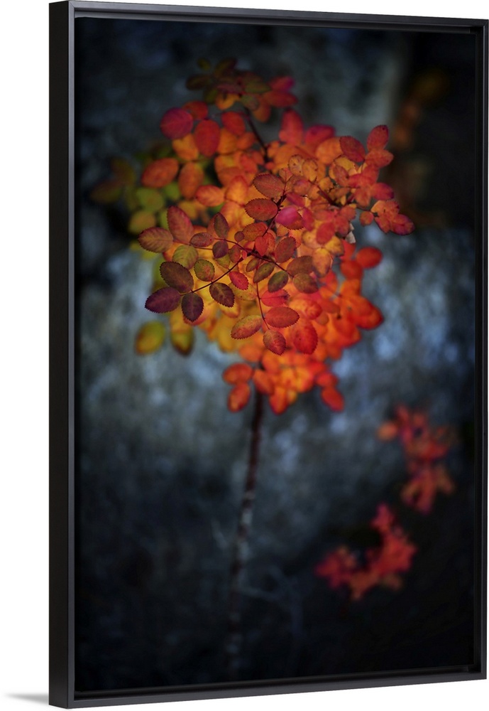 <p>I found this small rose bush one evening in October by a lake in British Columbia, Canada. The leaves had turned orange, but the glorious, intense evening light turned them to glowing gold, almost red. The image was made with a macro lens at f/2.8, to keep the leaves in front sharp while elegantly blurring the background of rocks and pebbles by the lake.</p>