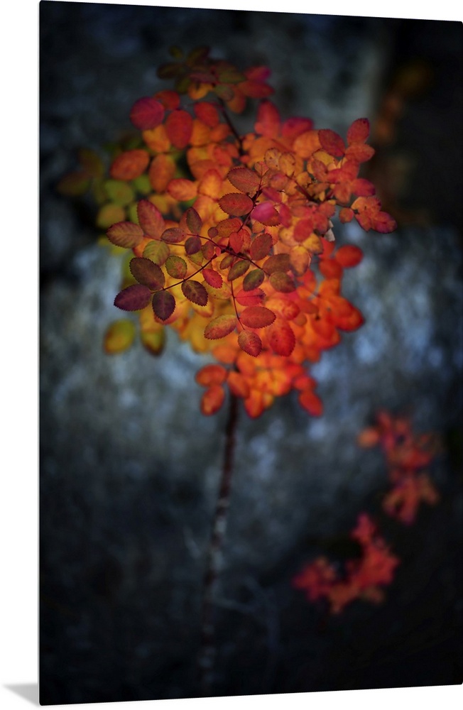 <p>I found this small rose bush one evening in October by a lake in British Columbia, Canada. The leaves had turned orange, but the glorious, intense evening light turned them to glowing gold, almost red. The image was made with a macro lens at f/2.8, to keep the leaves in front sharp while elegantly blurring the background of rocks and pebbles by the lake.</p>