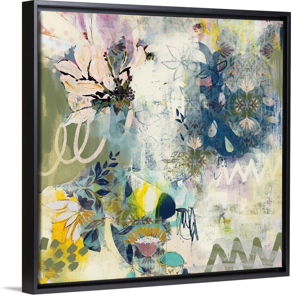 <p>Vibrant mixed-media abstract floral art with layered textures, botanical patterns, and bold brushstrokes in blues, greens, yellows, and pinks. Modern and decorative.</p>