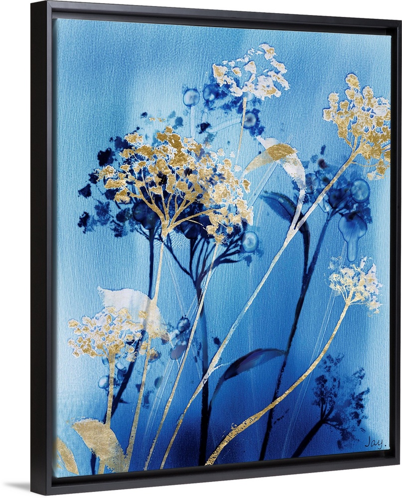 <p>A vertical artistic image of layered wild flowers in blue and metallic gold on fine lined brushed blue.</p>