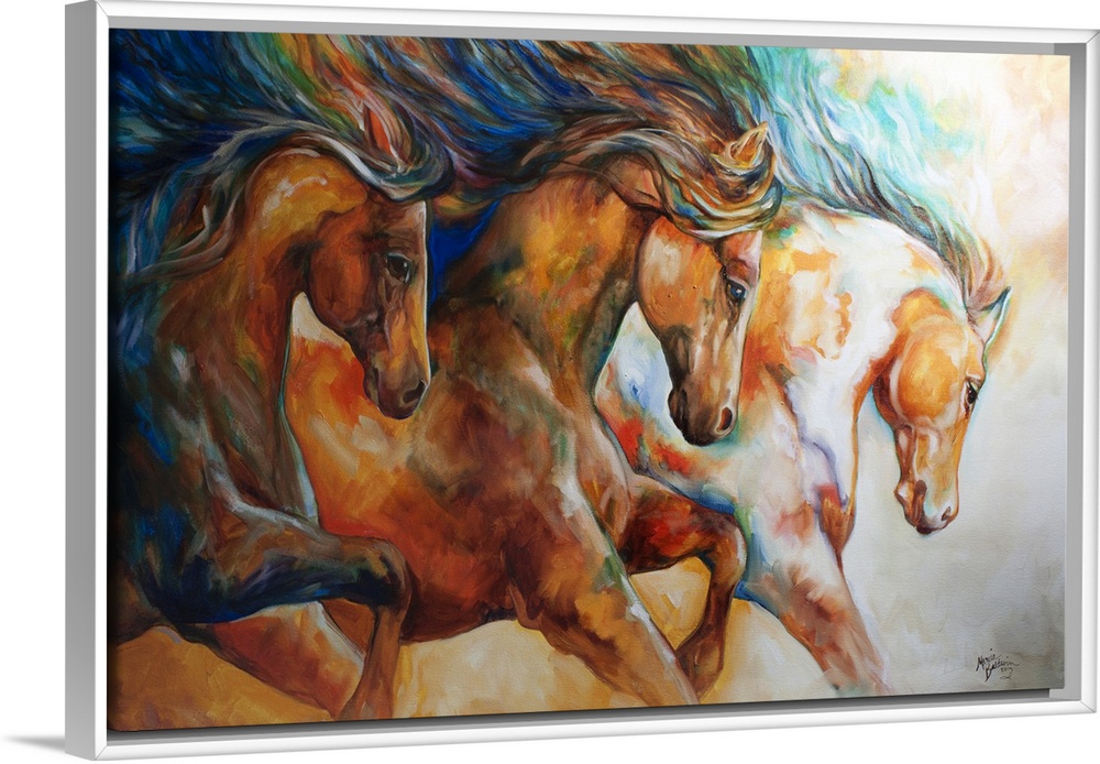 <p>Contemporary painting of three horses galloping in action with their mane's flowing.</p>