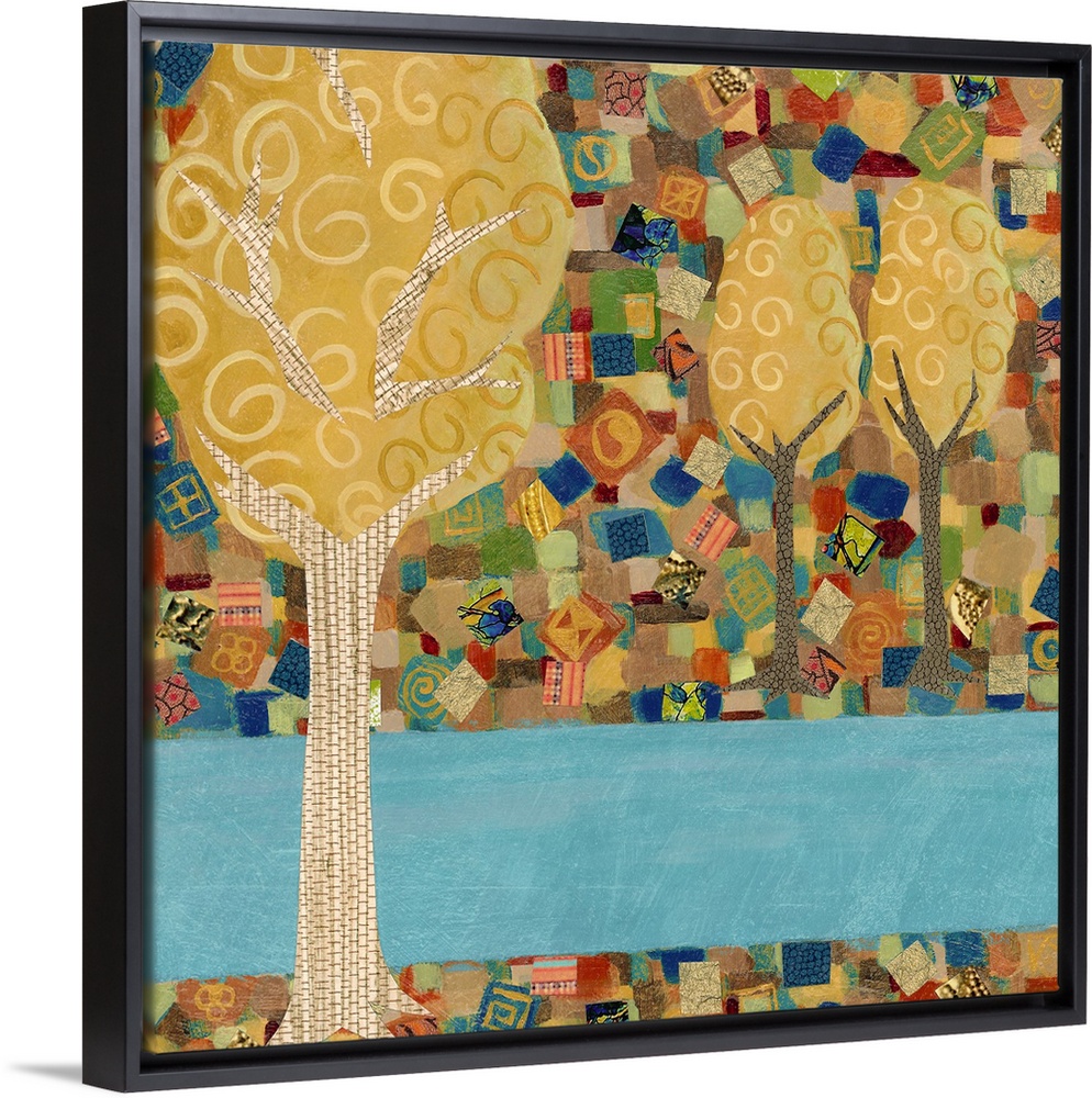 <p>Contemporary artwork of golden trees against a mosaic background.</p>