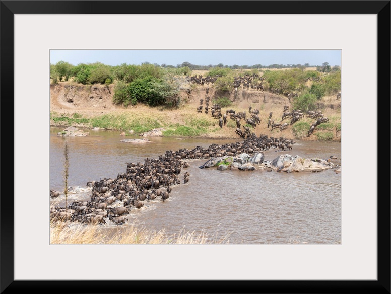 <p>Wildebeests frantically crossing the Mara river in the Serengeti Tanzania during the great migration.</p>