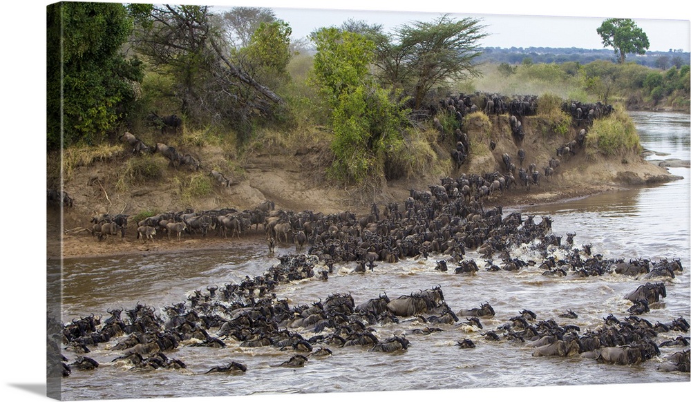 <p>Africa. Tanzania. Wildebeest herd crossing the Mara river during the annual Great Migration in Serengeti NP.</p>