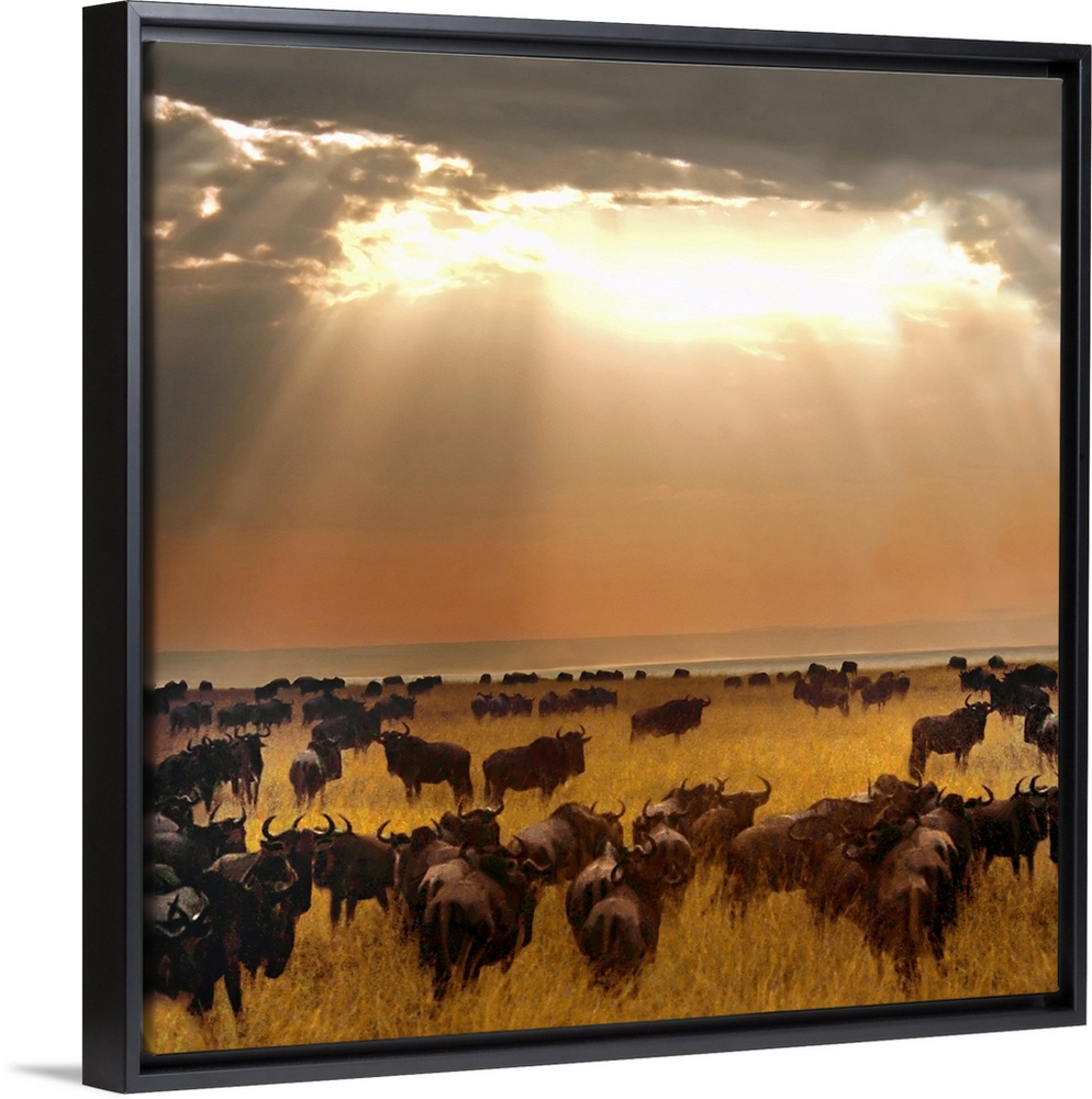 <p>Square, big photograph of the sun beaming down through a break in the clouds, onto a grassy files where a large herd of wildebeest graze.</p>