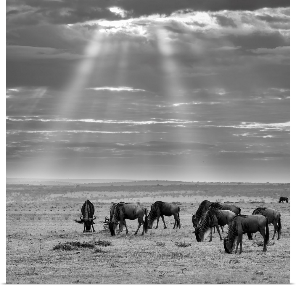 <p>Wildebeests (Connochaetes) (gnu) grazing on grass in the Maasai Mara, Kenya, East Africa, Africa</p>