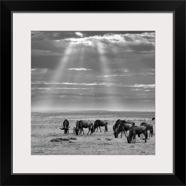 <p>Wildebeests (Connochaetes) (gnu) grazing on grass in the Maasai Mara, Kenya, East Africa, Africa</p>