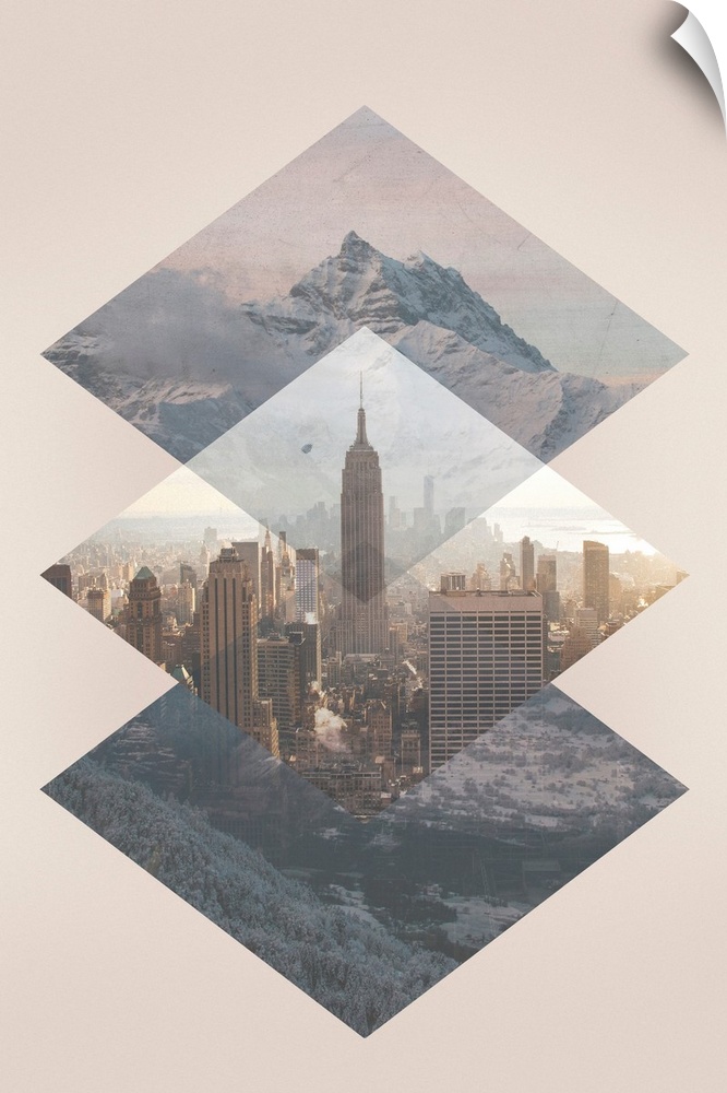 <p>Contemporary collage style artwork of stitched images of New York city and mountain ranges.</p>