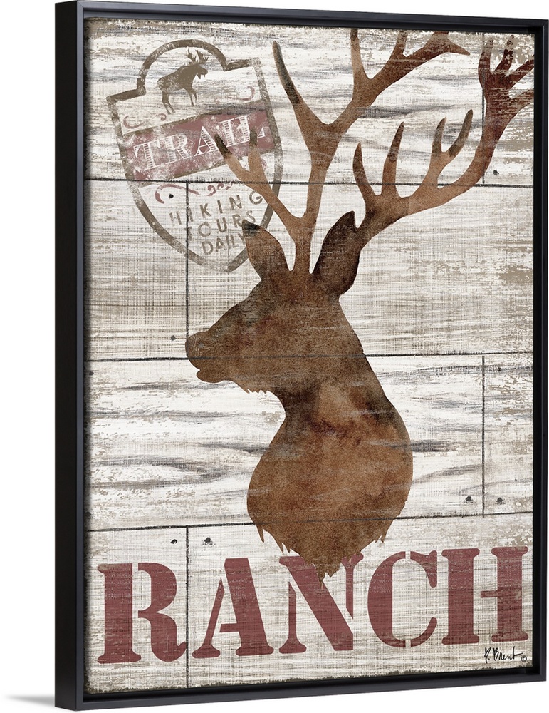 <p>Contemporary decorative artwork of a deer silhouette with the word "ranch" on a textured wooden background.</p>