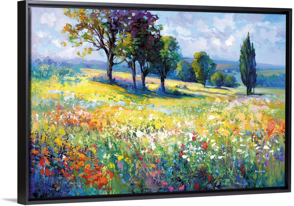 <p>A vibrant countryside unfolds under a bright sky, with wildflowers stretching across golden fields in every direction. Trees cast soft shadows over the hills, while colorful blossoms fill the scene with motion and warmth. This contemporary landscape artwork captures the feeling of summer with expressive color and open space.</p>