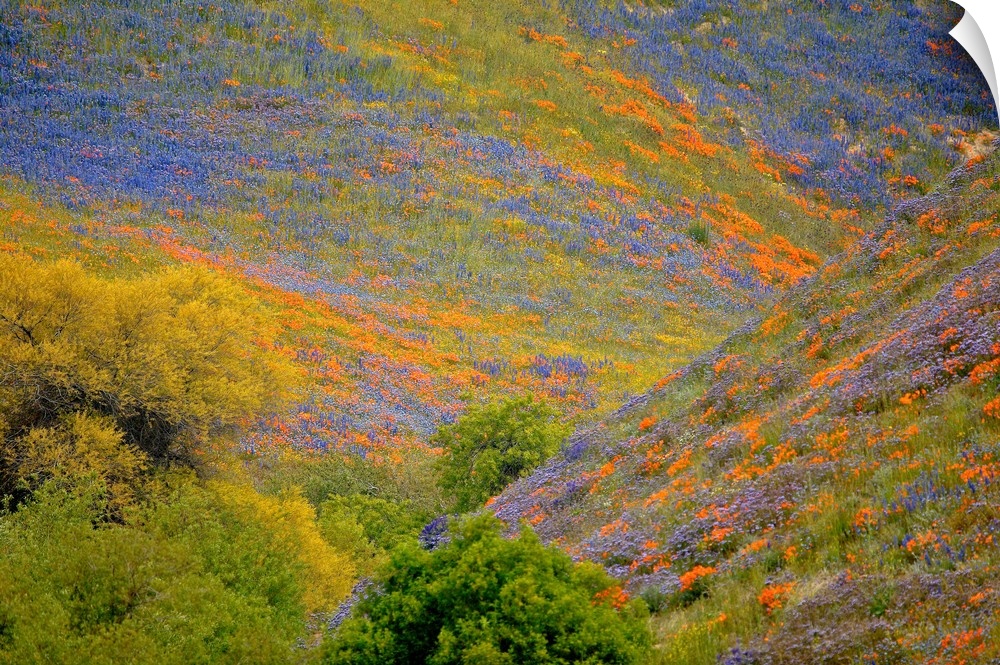 <p>Landscape photograph of rolling hills covered in purple and orange wildflowers.</p>