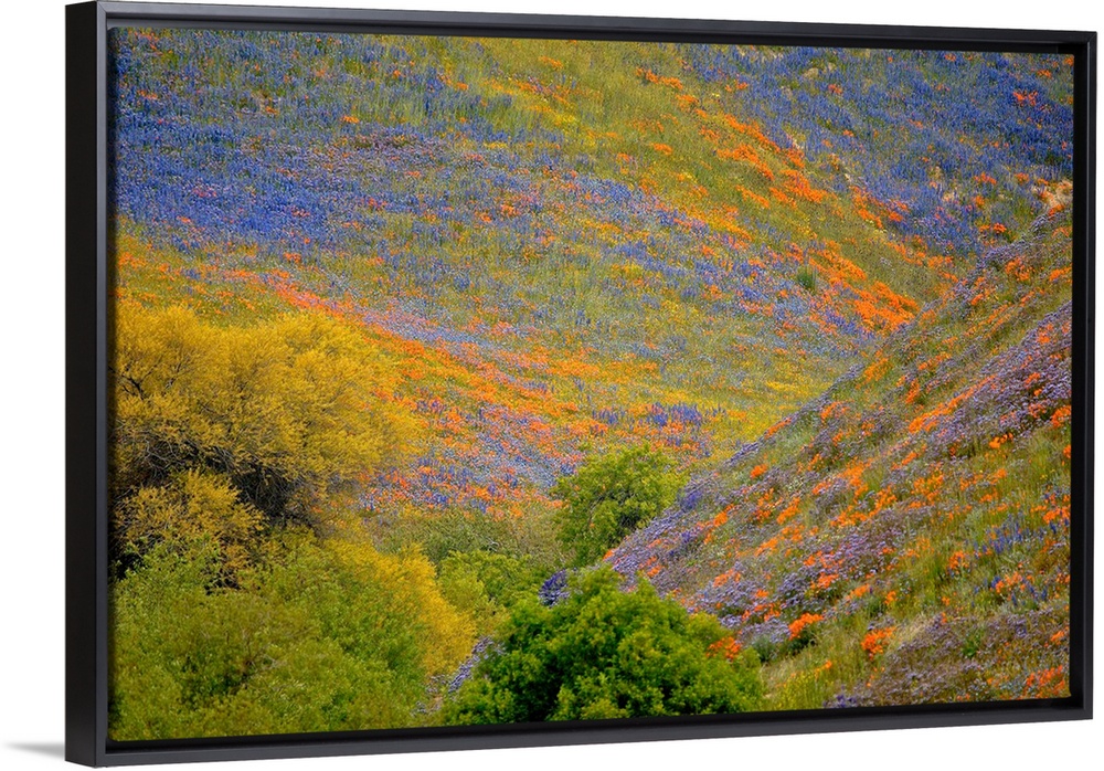 <p>Landscape photograph of rolling hills covered in purple and orange wildflowers.</p>