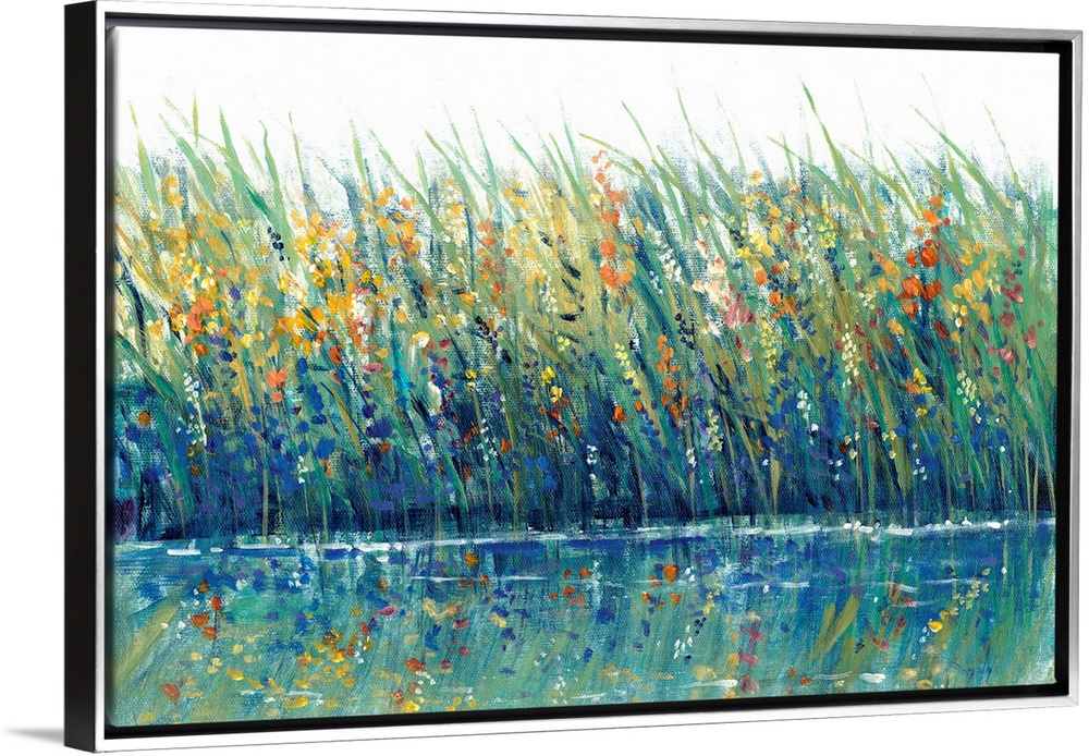 <p>A mass of grasses and reeds interspersed with wild flowers on the edge of a lake or pond; the flowers are reflected in the water below. Painted in warm, summery tones, this transitional style piece would add a sense of calm to a living room or bedroom.</p>