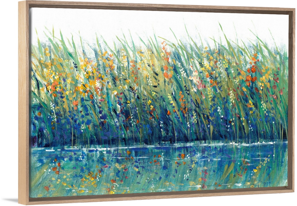 <p>A mass of grasses and reeds interspersed with wild flowers on the edge of a lake or pond; the flowers are reflected in the water below. Painted in warm, summery tones, this transitional style piece would add a sense of calm to a living room or bedroom.</p>