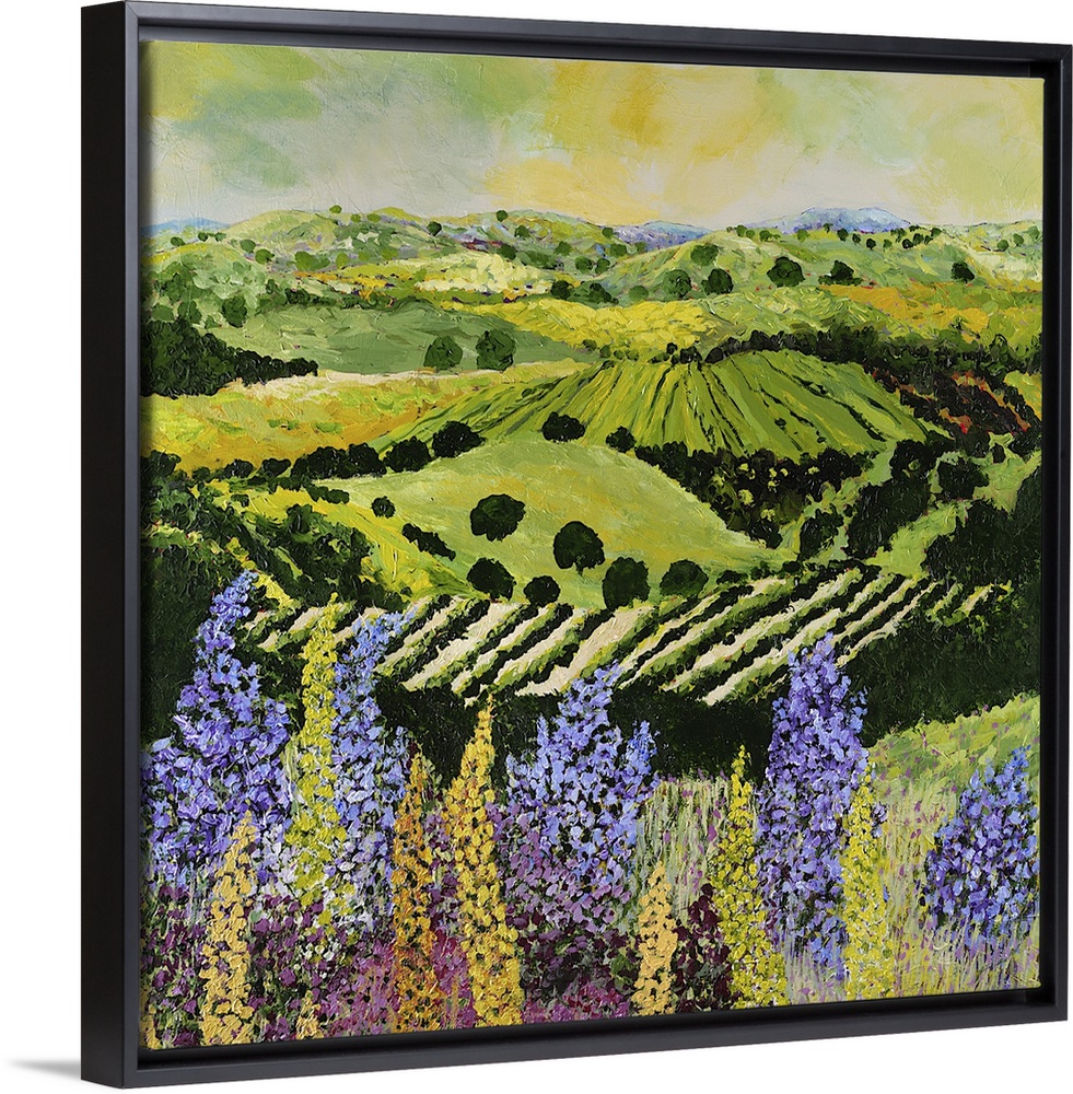 <p>Contemporary painting of a country landscape with lilacs overlooking rows of crops and hilly farmland.</p>