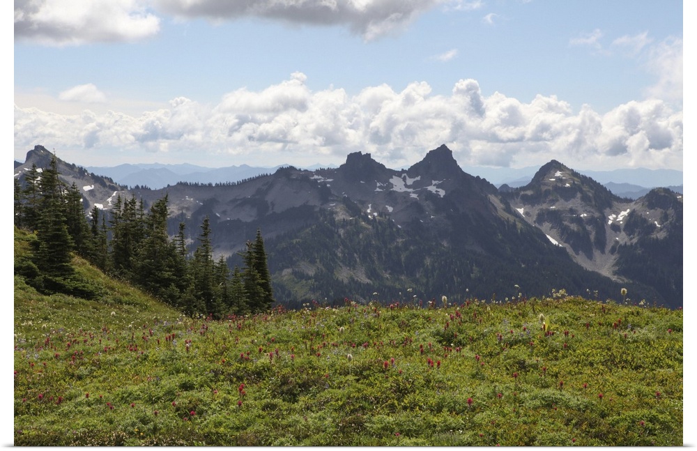 <p>With the Cascade Mountain Range in the background, wildflowers and trees cover the landscape on Mount Rainier. Mount Rainier National Park, Washington</p>