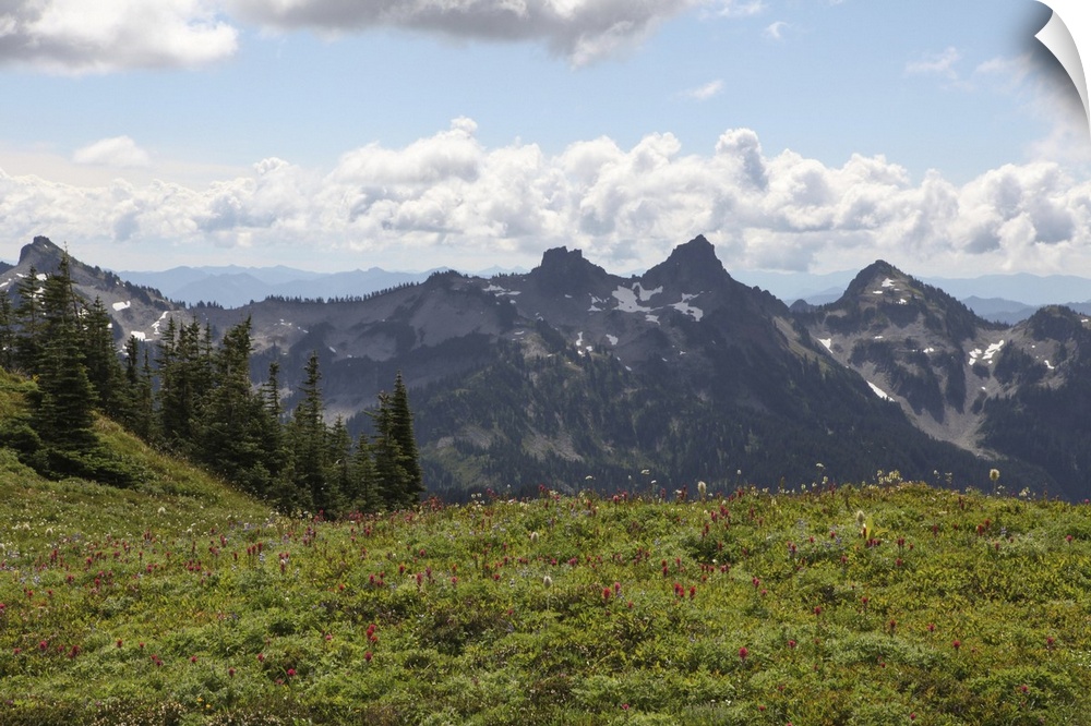 <p>With the Cascade Mountain Range in the background, wildflowers and trees cover the landscape on Mount Rainier. Mount Rainier National Park, Washington</p>