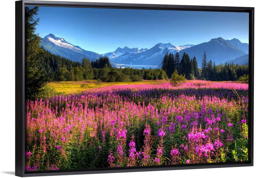 <p>Oversized wall art of a meadow of wildflowers in a valley of evergreen trees with an Alaskan glacier in the background.</p>