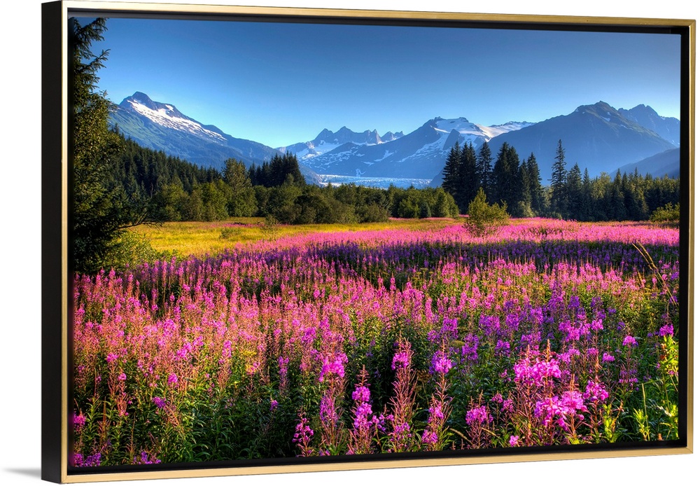 <p>Oversized wall art of a meadow of wildflowers in a valley of evergreen trees with an Alaskan glacier in the background.</p>