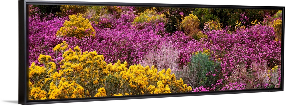 <p>A wide angle photograph taken of purple and yellow wildflowers that cover the land they are on.</p>
