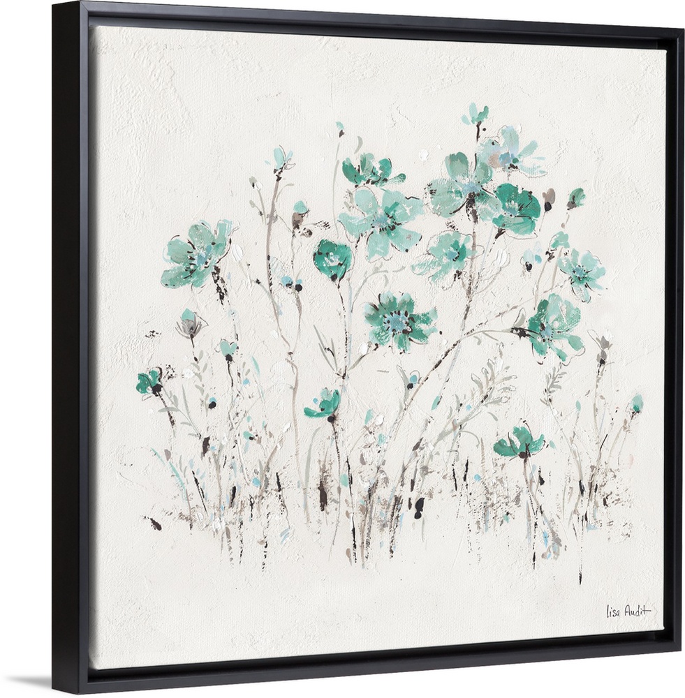<p>Contemporary artwork of turquoise wildflowers sprouting from a textured white background.</p>