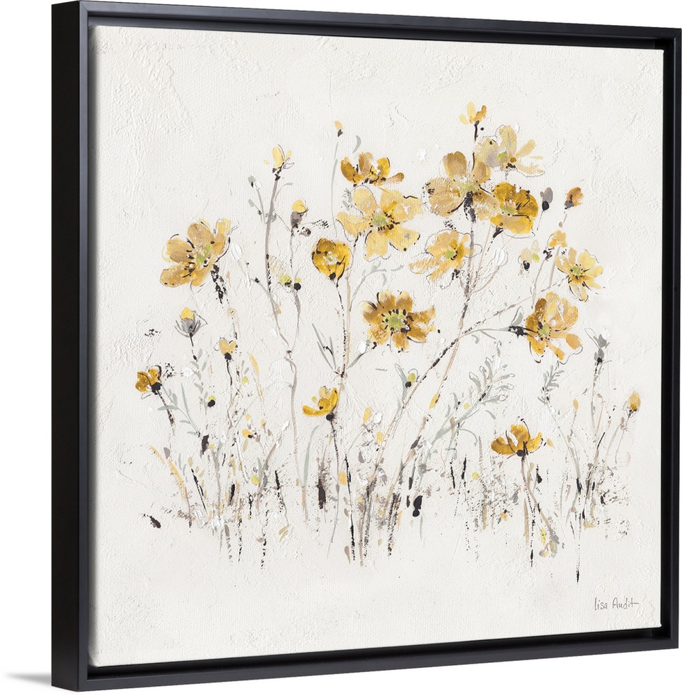 <p>Contemporary artwork of yellow wildflowers sprouting from a textured white background.</p>