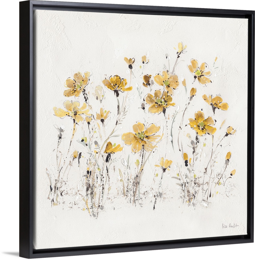 <p>Contemporary artwork of yellow wildflowers sprouting from a textured white background.</p>