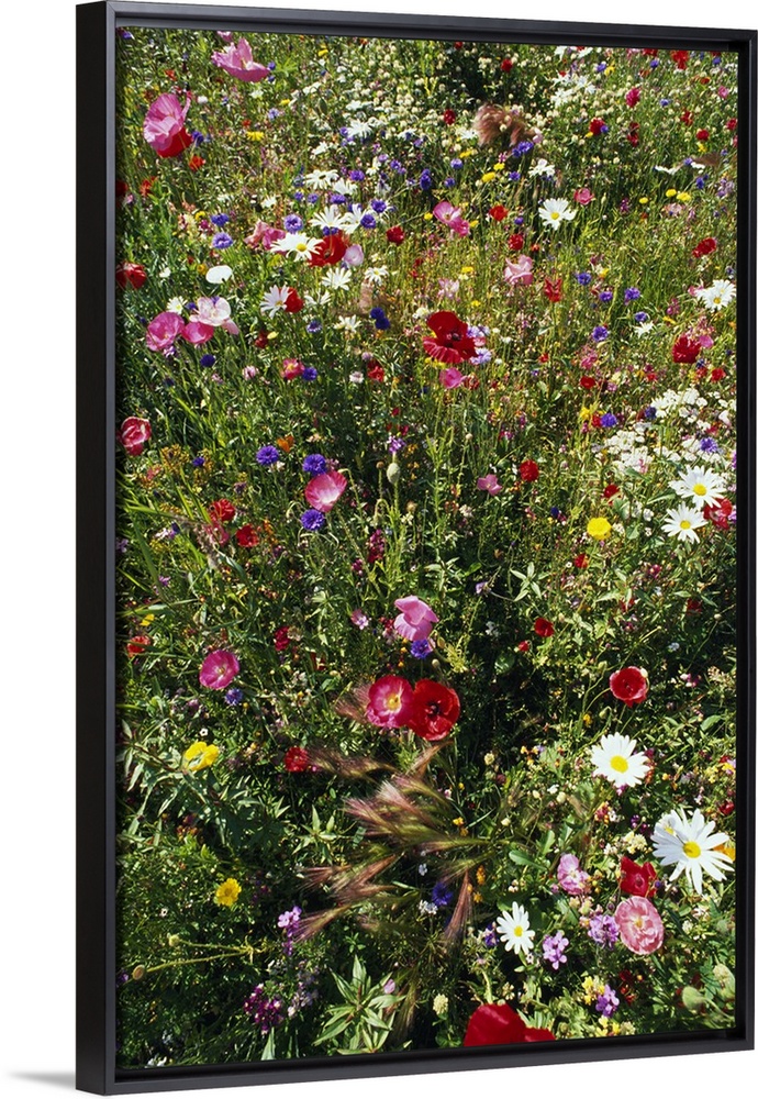 <p>Colorful wildflowers in a field are photographed closely from above.</p>